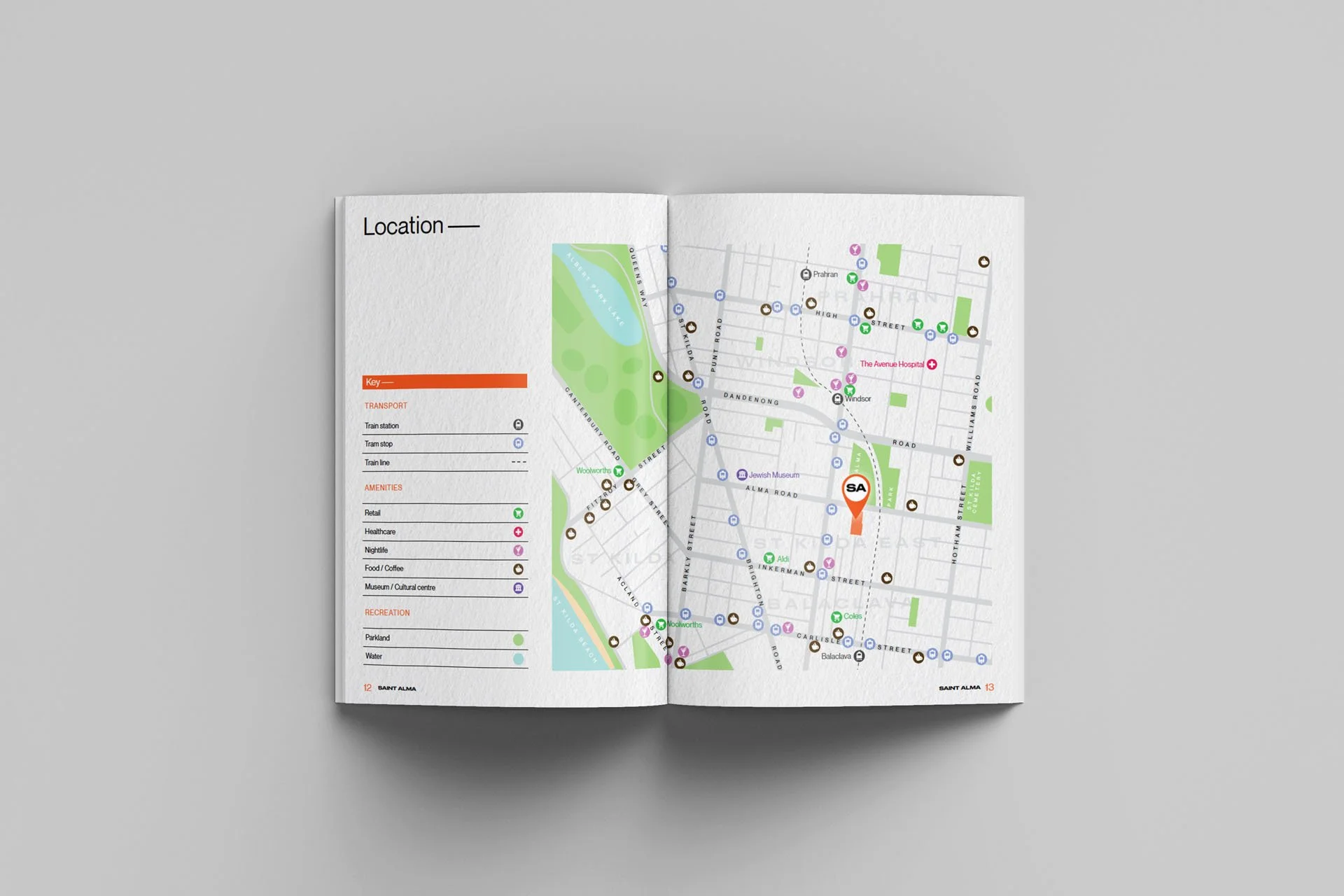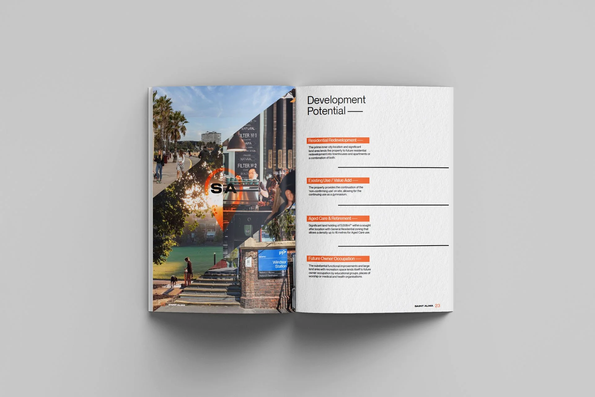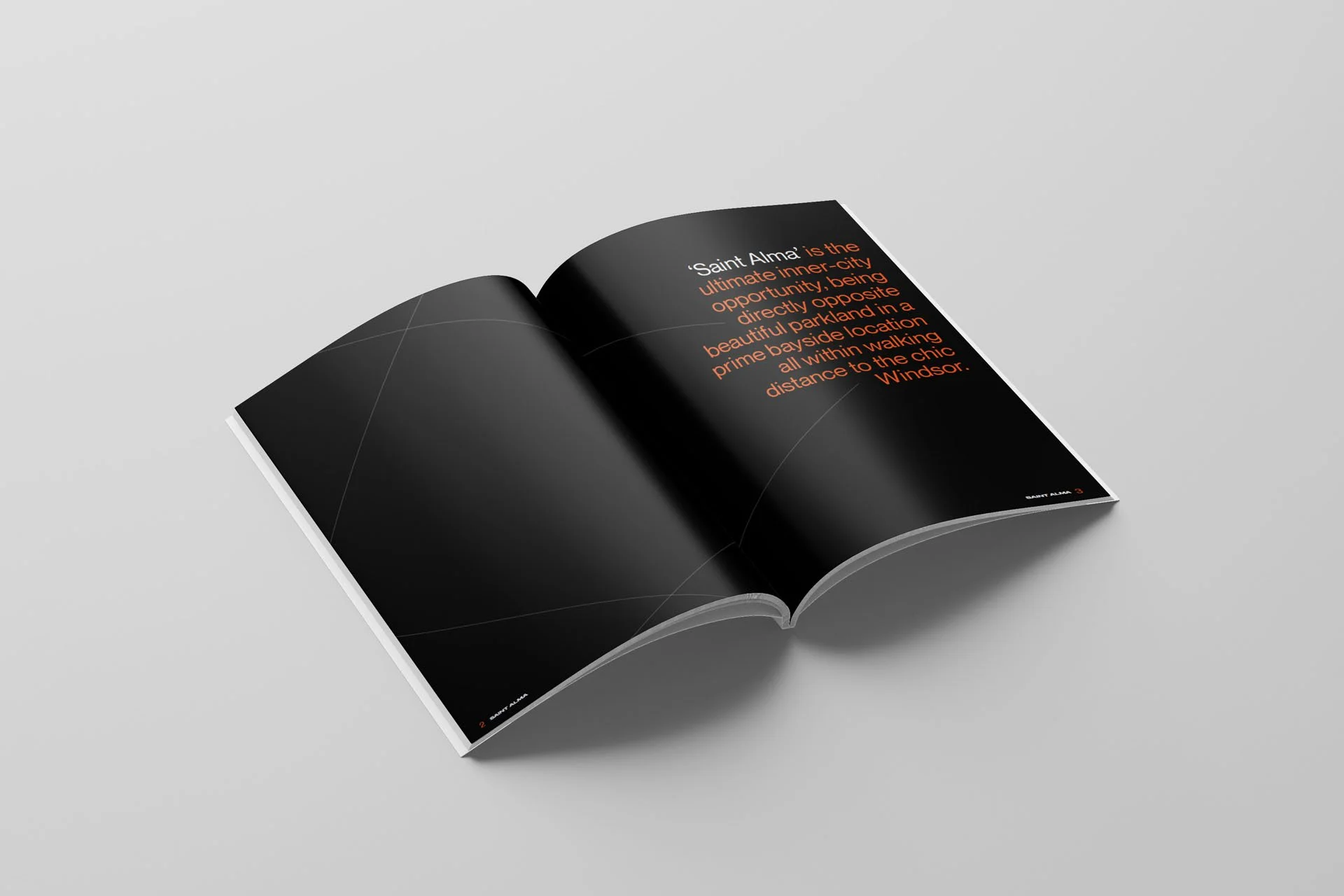 Perfectly positioned directly across from Alma Park and nestled between the cosmopolitan suburbs of St Kilda, Windsor, Prahran and Albert Park, Red Crayon named and branded the site Saint Alma. The accompanying Information Memorandum features a contemporary monochrome design accentuated with a pop of orange throughout to portray the premium asset location within this highly sought after urban vicinity. The minimal design captured the sites endless possibilities.