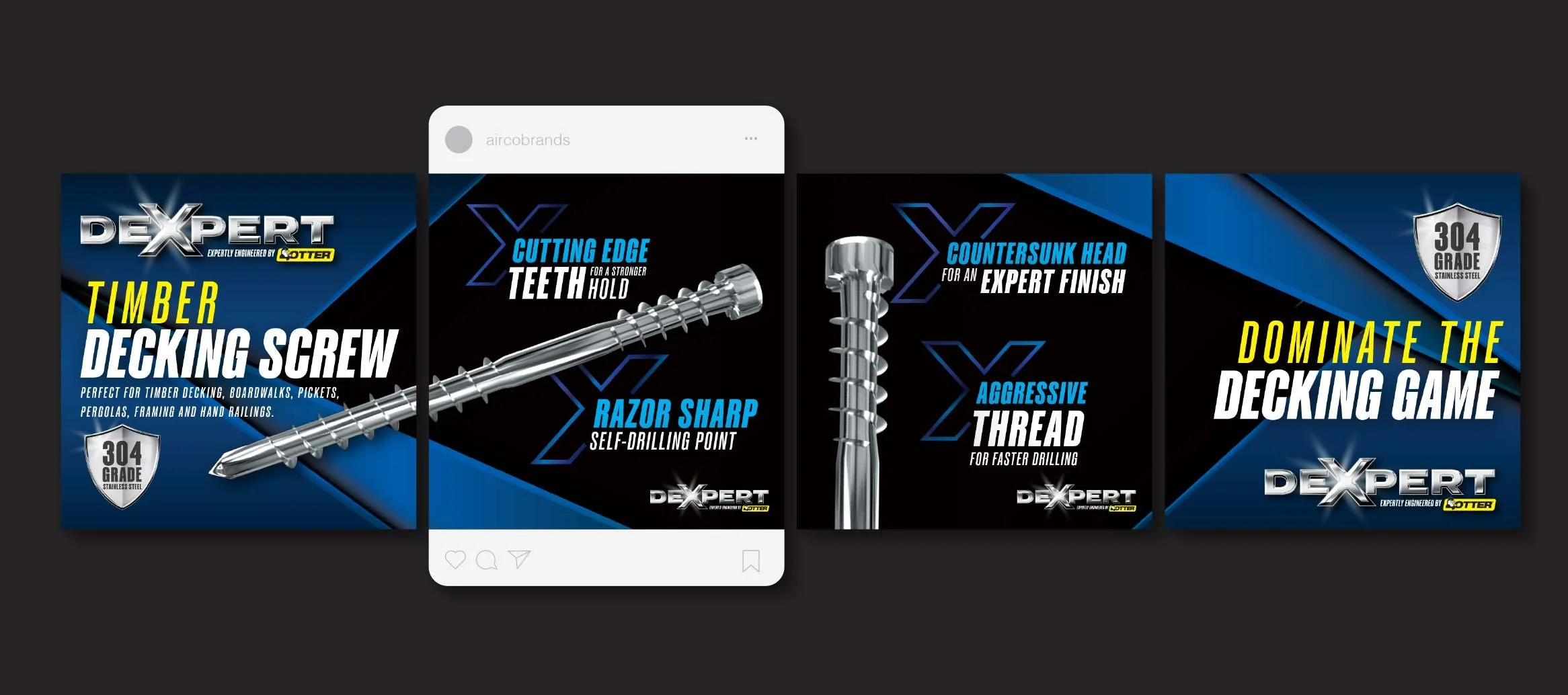 Airco Brands is an Australian owned company who have been specialising in providing quality tools and fasteners to the construction, manufacturing, retail, and rural markets for over 60 years. We were engaged by Airco Brands to help support their marketing team with the launch of their new product, the Otter dEXPERT decking screw. As part of the brief, they required several new assets to support the launch of the new product, both in-store and online. These assets included the overall look, feel and theme for the packaging packaging, various packaging designs, POS displays, 3D renders of the screw, digital campaign assets, and a campaign landing page.