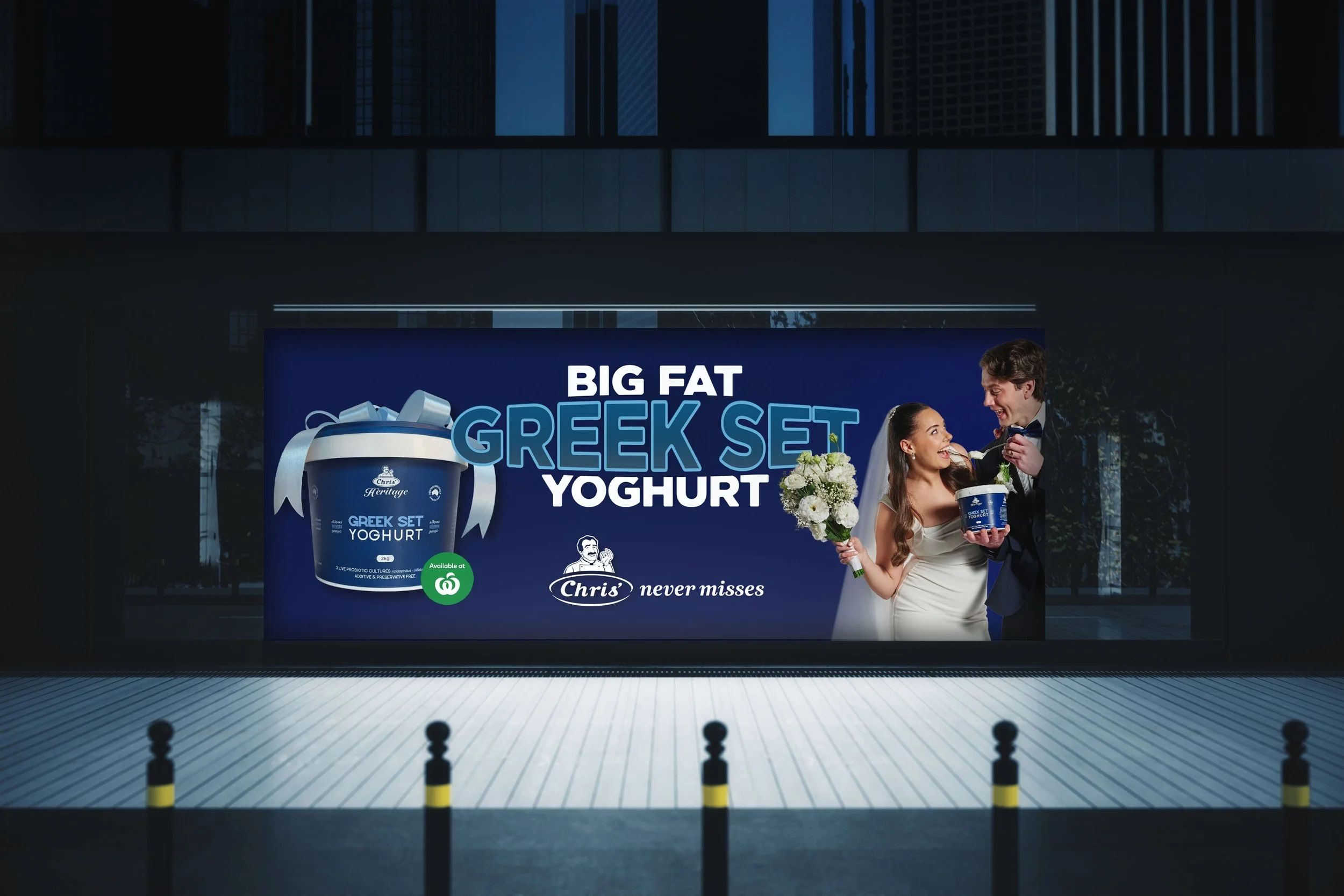 We made Chris’ yoghurt unmissable by dialling up what makes it unmistakable. “My Big. Fat. Greek Set Yoghurt.” isn’t just the product truth, it’s a bold, culturally charged platform that celebrates size, taste and heritage in one confident line and gives a little wink to one of our favourite movies of all time.